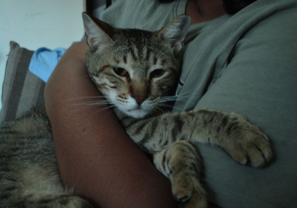 Now Russel has transformed into a gentle, affectionate tiger-stripy gentleman. And one thing everyone notices instantly: those eyes. Deep, soulful, brown-green eyes that sometimes look wise, sometimes a little serious — as if he’s remembering the sister he once adored, or quietly wondering where his forever family might be. There’s a whole story in that gaze, and it’s impossible not to feel it.