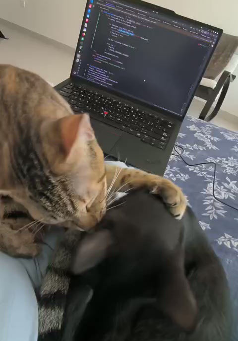 Shadow and Pepper are siblings, around eight to nine months old, who have been together since the very beginning. They were rescued as tiny kittens from an industrial zone and grew up side by side, later settling into a foster home with children. Their shared history shows in the quiet, everyday ways they move through life — checking in with each other, grooming together, and reuniting naturally whenever one of them needs reassurance.
