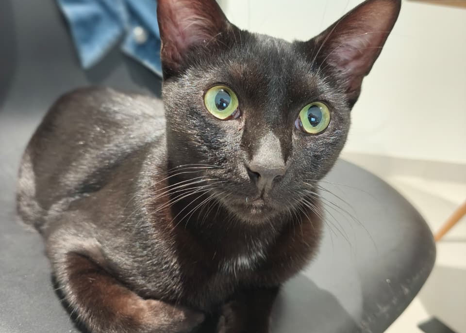 Shadow is a glossy black boy with a great deal of confidence and an even greater sense of entitlement. He is openly affectionate, deeply loving, and entirely convinced that humans exist primarily for cuddling. He asks for attention, curls himself up against you at every opportunity, and has developed a full vocabulary for expressing his needs. He is bold, communicative and extremely patient with young children, happily staying involved in play for far longer than expected.